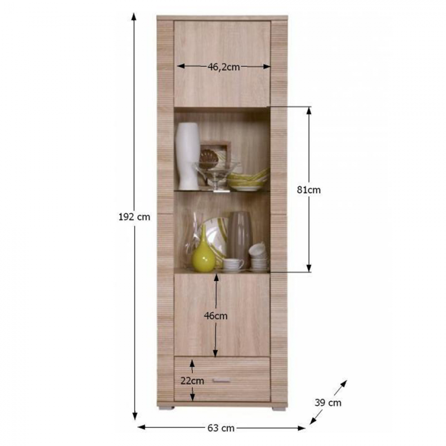 Vitrína typ 05, vhodná na zařízení obývacích pokojů, ložnic i pracoven, materiál: DTD laminovaná. Hrany jednotlivých komponentů jsou ukončeny vroubkovanou lištou. Barevné provedení: dub sonoma. Rozměry (ŠxVxH): 63x192x39 cm. Dodávána v demontu, skladem - ihned k odběru.